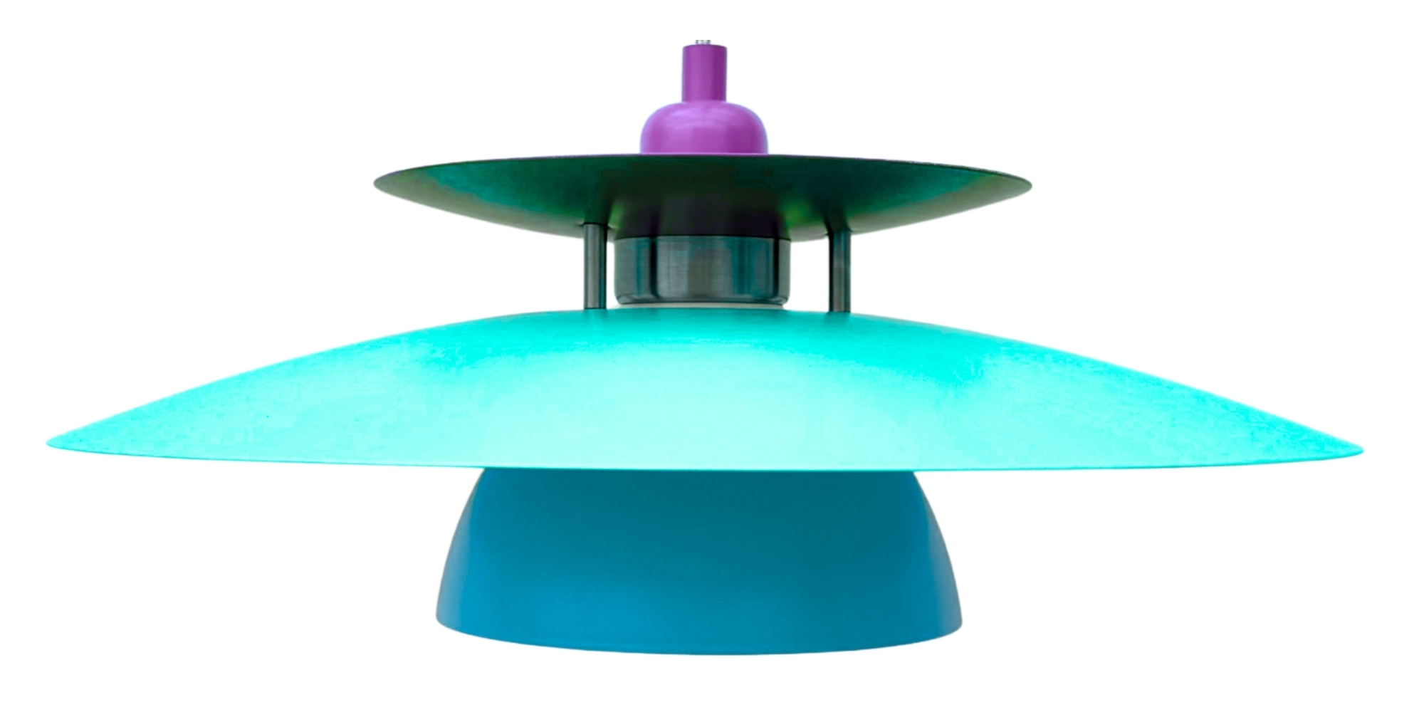 En tidløs lampe i børstet stål med nuancer af lilla, frisk turkis og petroleumsblå, der tilfører rummet en frisk lethed og en rolig, flydende stemning. Ø43 cm og designet til at sprede lyset blødt og levende.