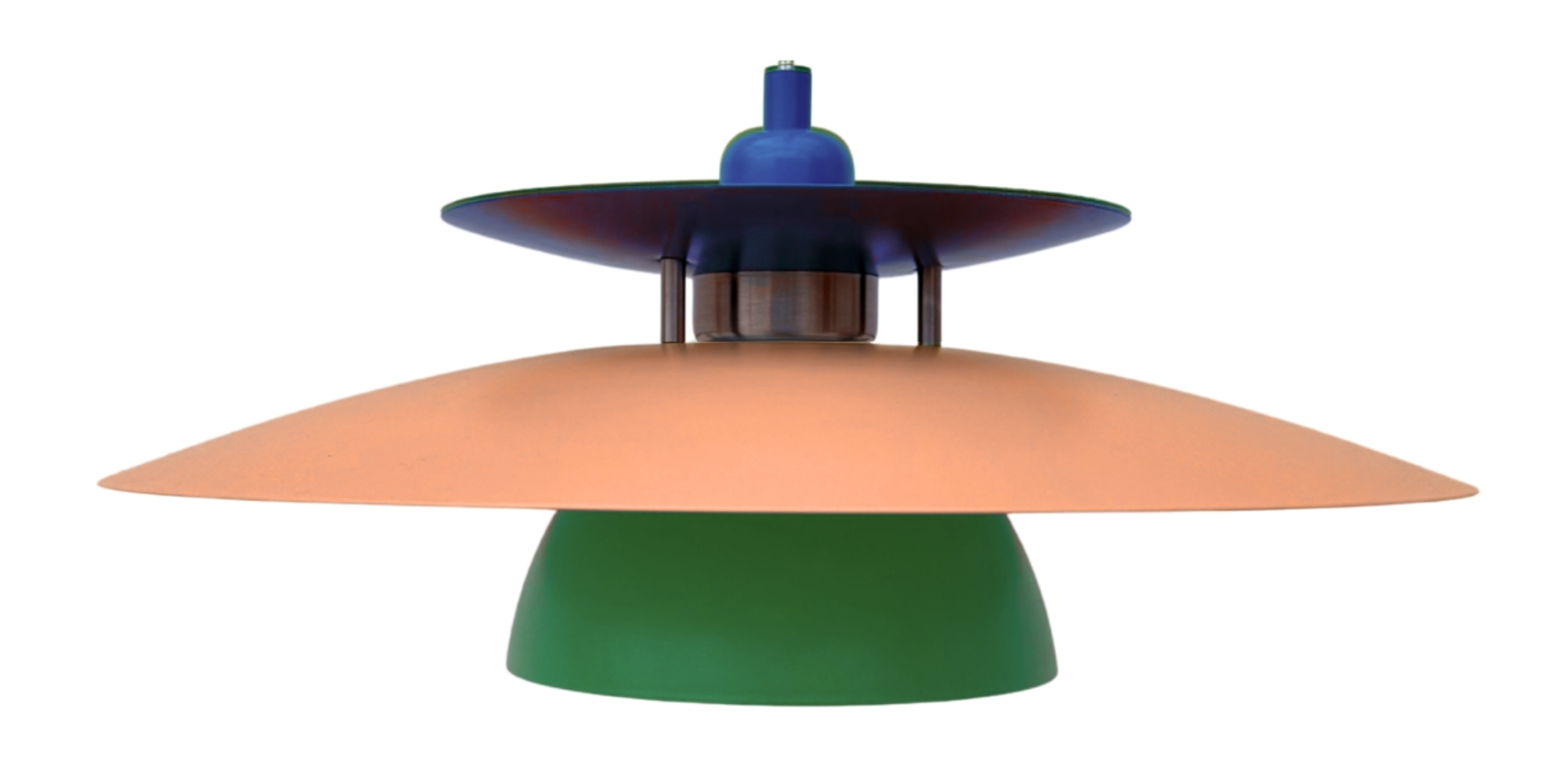 En tidløs lampe i børstet stål med nuancer af mørkeblå, gylden orange og emeraldgrøn, der tilfører rummet en rolig dybde og en naturlig, afbalanceret elegance. Ø43 cm og designet til at sprede lyset blødt og levende.